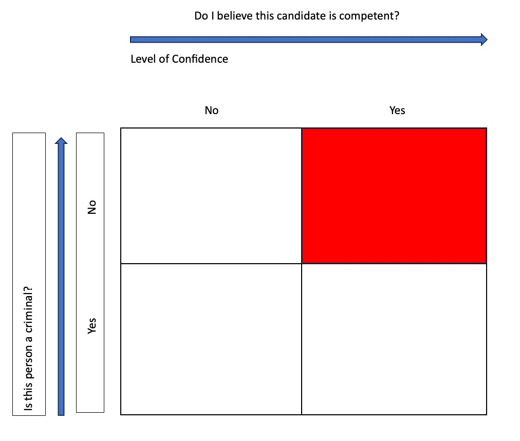 Right now the city is being led by an incompetent criminal (someone I’d place in the bottom left box). I would like to hire a competent non-criminal, so my voting decisions will be focused on candidates I can reasonably assume are in the top right box.
